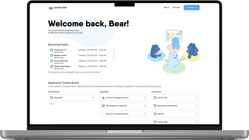 The Sproul Club project aimed to create a centralized platform for students to discover and connect with clubs at UC Berkeley. As a Product Designer, I played a key role in designing the club pages and discovery cards, crucial elements for user engagement and club visibility. This project spanned [mention the timeframe, e.g., 6 months from initial concept to beta launch and iteration]. My focus was on creating intuitive and visually appealing interfaces that facilitated seamless club discovery and interaction, contributing to a significant increase in user engagement.