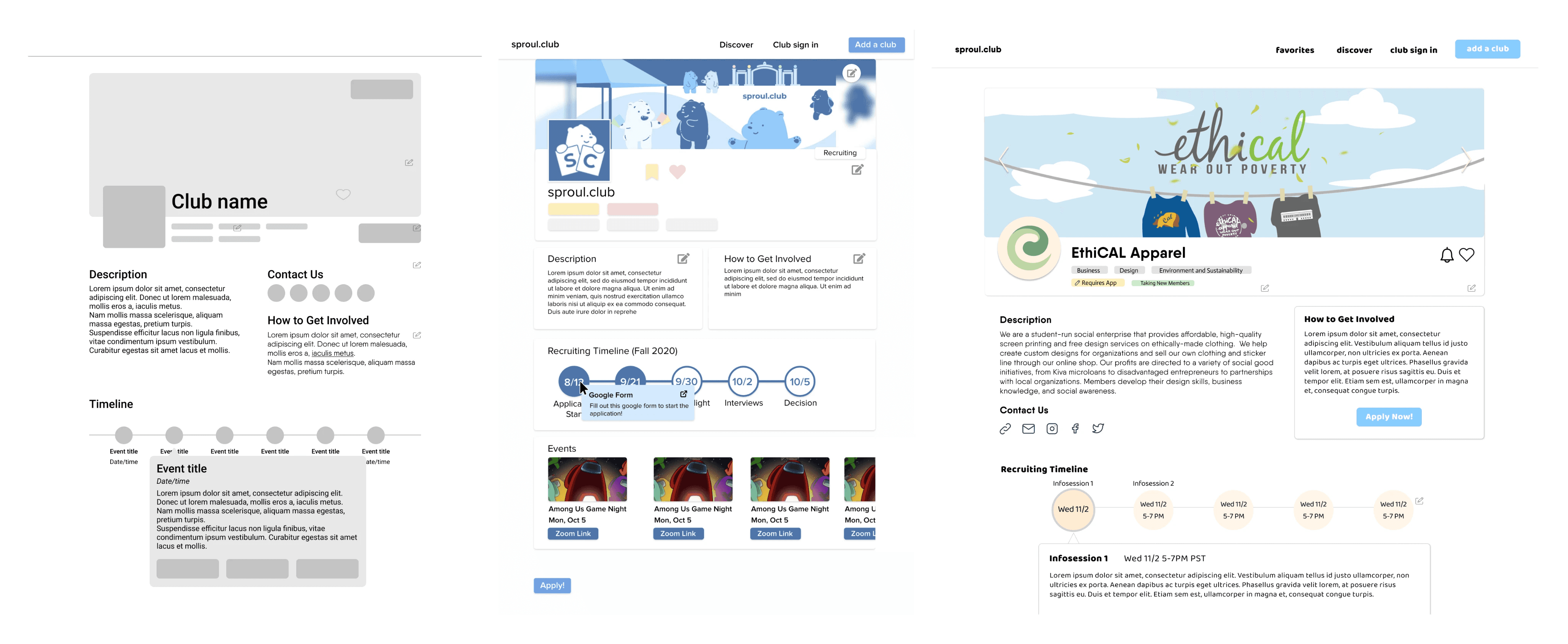 Creating low-fidelity wireframes and high-fidelity mockups for club pages and cards.